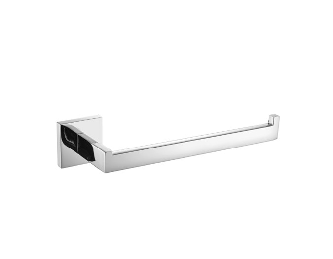 Toallero tipo brazo para montaje en pared, acero inoxidable, superficie de alto brillo, tapa cuadrada para ocultar los tornillos de fijación con orificio en la parte inferior para facilitar el montaje, incluye pasadores y tornillos de acero inoxidable.