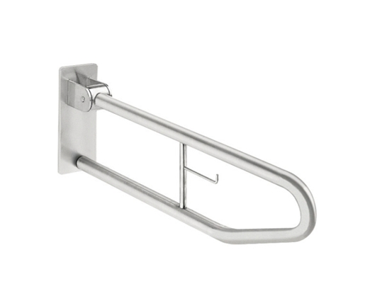 Barra de apoyo abatible con portarrollos de inodoro para montaje a pared, acero de cromo-niquel, acabado satinado, rectificado con efecto antideslizante, espesor de material 1,2 mm, diámetro del tubo 32 mm, en forma de abrazadera, con portarrollos de inodoro, protección frente a plegado hacia abajo indeseado, amortiguador de tope de goma, probado y certificado (LGA), placa de montaje de 4,0 mm de espesor con tres agujeros de fijación, incluye tornillos de acero inoxidable y tacos.