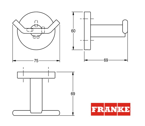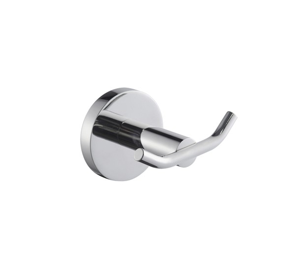 Perchero doble para montaje en pared, acero inoxidable, superficie de alto brillo, tapa redondeada para ocultar los tornillos de fijación con orificio en la parte inferior para facilitar el montaje, incluye pasadores y tornillos de acero inoxidable.